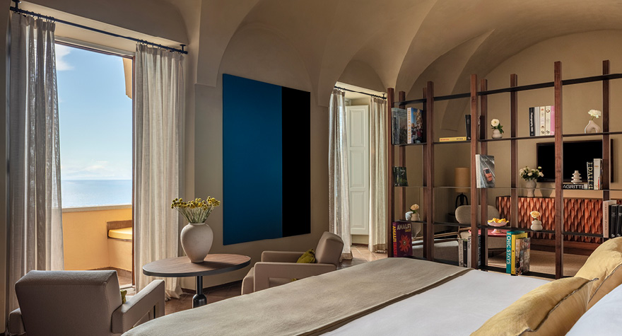 这个典雅迷人的套房坐落在历史悠久的修道院食堂内,几个世纪之前,圣芳济教会(Capuchin)的僧侣们曾在此聚会。宽敞卧室和起居室内的特色装饰无声地讲述了这里曾经上演的精彩历史,天然材质和当地艺术作品点缀其间,清凉舒爽的阵阵海风穿堂而过,空气中弥漫着柠檬的迷人清香。下榻的宾客可以尽情享受修道院的宁静淡然,并可选择双阳台房型,饱览波光粼粼的第勒尼安海那非凡动人的景致。