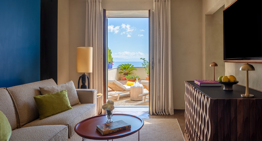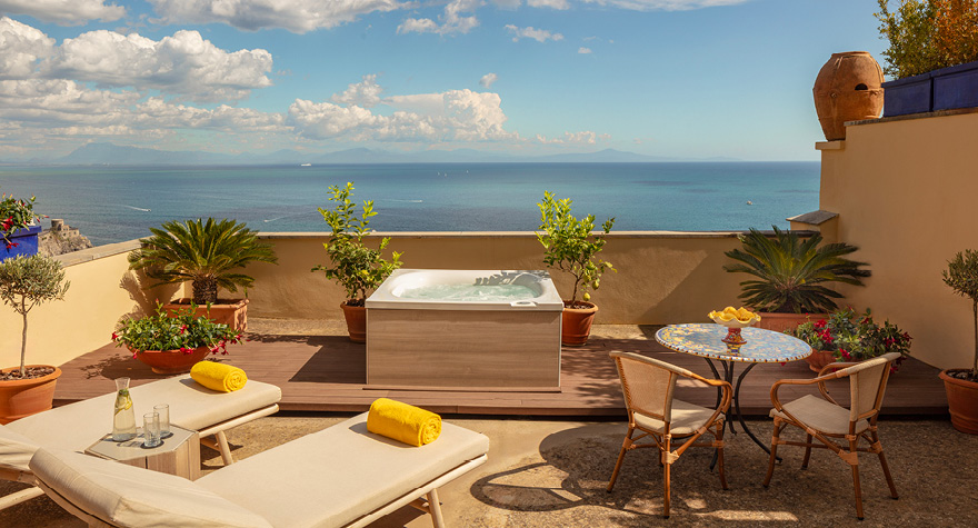 我们的海景套房(露台房,配备按摩浴缸)集私密、舒适和美景于一体。移步宽敞的私密阳台,在无比舒适的按摩浴缸内悠享轻松时刻,尽情欣赏阿马尔菲海滨变幻万千的醉人海景。幸福时刻,悄然绽放:一边啜饮香气芬芳的意大利白葡萄酒普罗塞克(prosecco),一边从这个得天独厚的绝佳位置欣赏第勒尼安海的迷人景色,书写奢华海滨假日生活的华丽诗篇。您可以在室外尽情放松,亦可移步室内,感受这间典雅套房的舒适迷人,包括时尚起居室和豪华特大床。