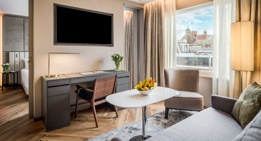 标准套房 设有一个时尚典雅的起居区,空间更加宽敞,非常适合那些想要边旅行边工作,或希望长住的宾客。全天享用醇香意式浓缩咖啡和本地特色零食,保持满格活力,亦可打开两台纯平电视中的一台,实时纵览国际动态。