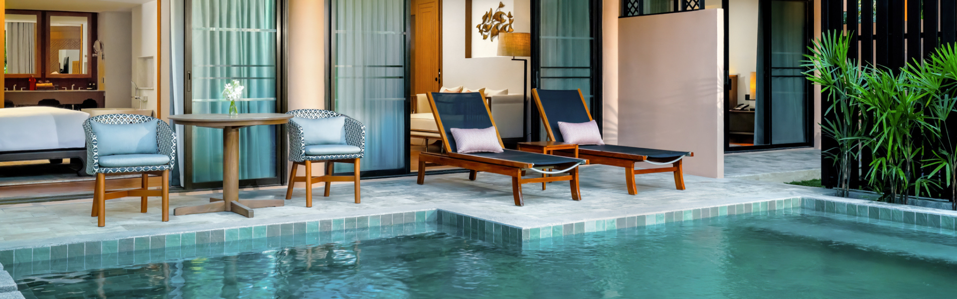 在宁静的池畔酒吧享受隐秘舒适的空间。