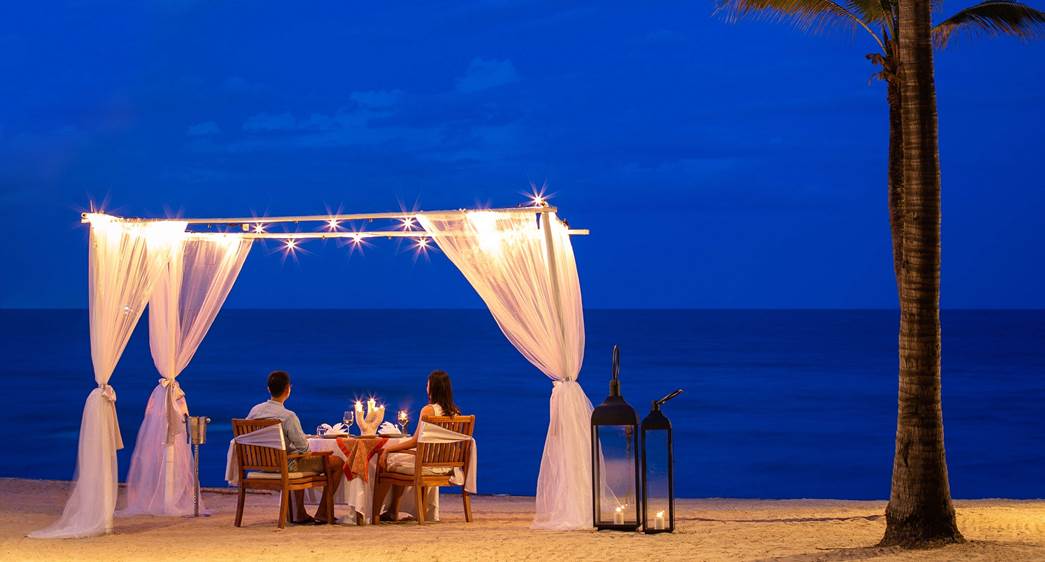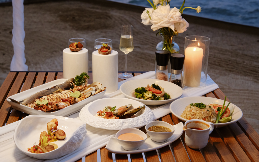 选择浪漫的用餐环境,灯笼照亮的泻湖花园,到沙滩上的餐桌或泰亭,任您挑选。 您可以享用精致的海鲜、泰式风味或烧烤菜肴,或与您的私人厨师选定自创的菜品。 根据葡萄酒大师的推荐为每道菜搭配美酒,当晚还可以享受私人管家提供的优质服务。