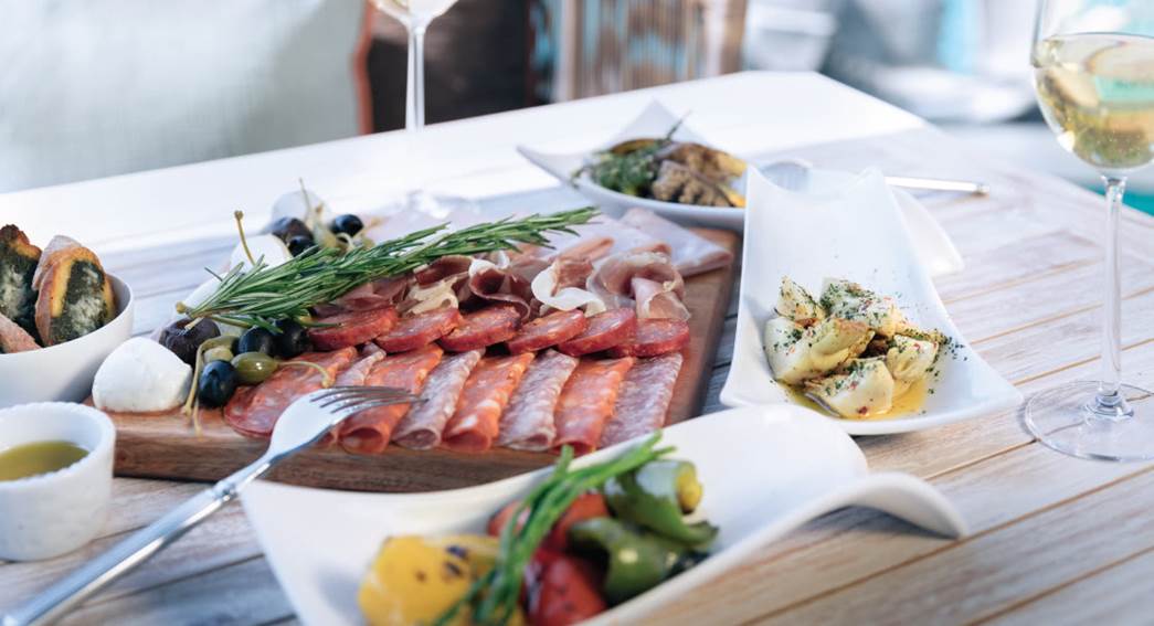 拼盘选品包括帕尔马火腿、熟香肠、多种萨拉米香肠与醋浸带枝水瓜果、香醋洋葱、朝鲜蓟、橄榄、格拉纳帕达诺和恰巴塔。