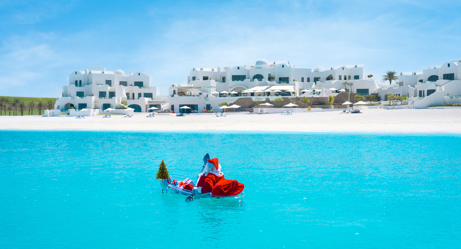在宁静的圣托里尼风格环境中,点亮我们宏伟的圣诞树,拉开节日的序幕。